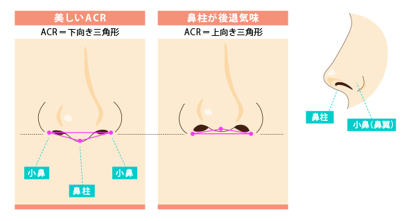 このように理想の鼻(左上)は下から見た時に鼻の形が正三角形を作ります。