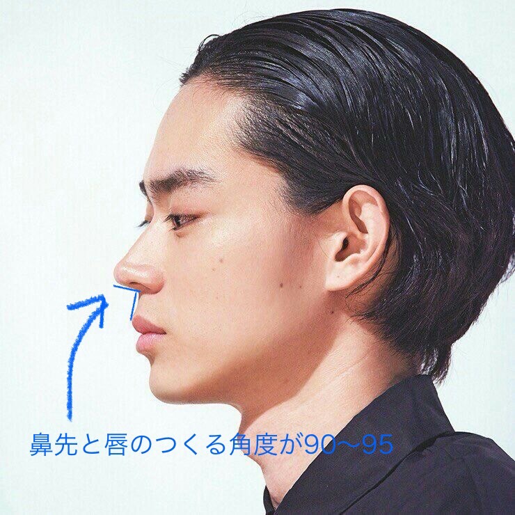 鼻先と上唇の角度(鼻唇角)は**90〜95°**が理想とされています。